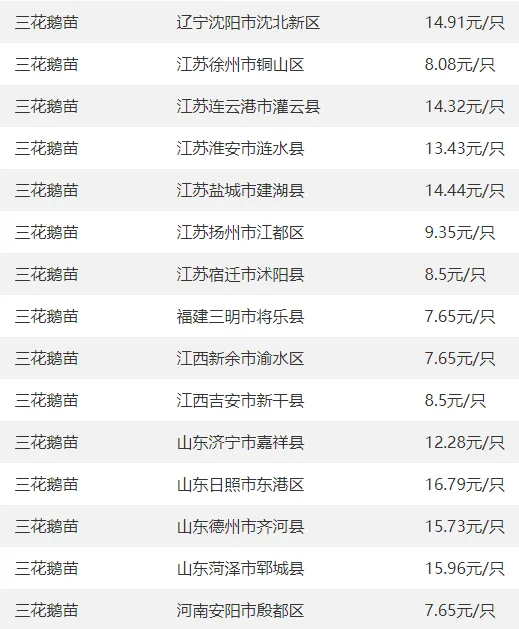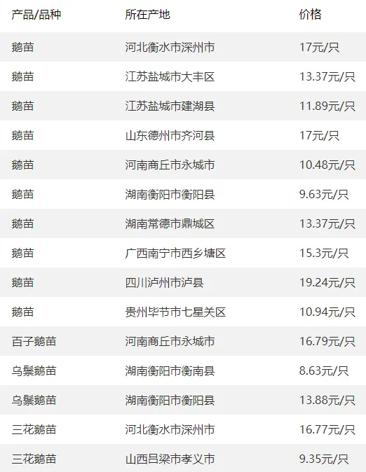 全国部分地区鹅苗价格参考