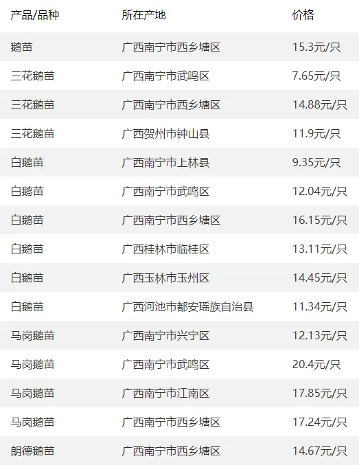 广西部分地区鹅苗价格参考