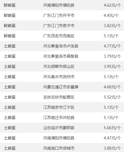 全国部分地区鹅蛋价格参考