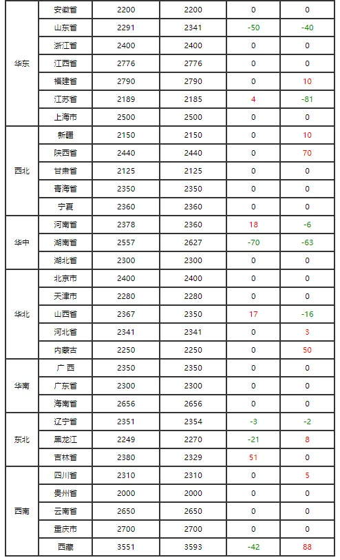 淘汰鸡行情稳中有升,南北价差明显,红鸡活禽主流报价4.5-5.3元/斤,粉鸡价格普遍低0.2-0.3元/斤,屠宰价较活禽价低0.3-0.5元/斤。豫陕、川渝等高价区小幅上涨0.1元/斤,河南红鸡报价4.9-5.2元/斤;华北、东北局部跟涨,河北红鸡4.8-4.9元/斤,华东、华南多数地区保持稳定。