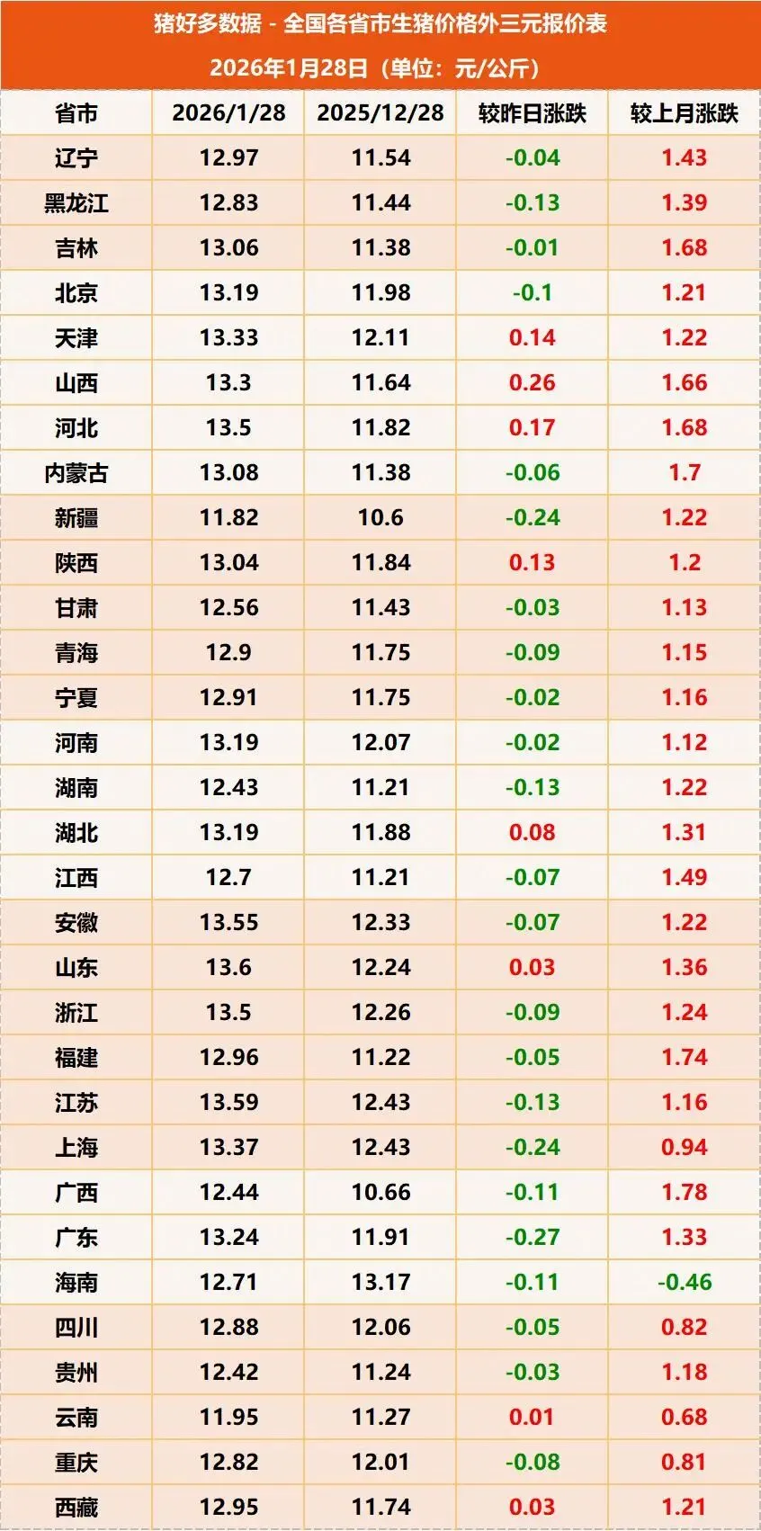 突发转跌!月末猪价回调态势明显,今日全国23省市生猪行情集体“飘绿”!据猪好多数据监测显示,2026年1月28日全国外三元生猪均价为12.92元/公斤,较昨日下跌0.06元/公斤,相较于昨日0.03元/公斤的跌幅,猪价显露出越跌越猛的趋势。养殖户关心的是春节前猪价还有没有上涨的机会?