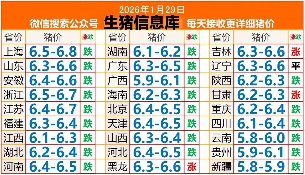猪价下滑26.01.29 养羊网 2026-01-28 猪价下滑26.01.29 养羊网 2026-01-28 上一篇:鸡蛋价格大降!福州人几乎家家都买! 下一篇:今日鸡蛋价格(2026.1.28) 您可能还会对下面的文章感兴趣111: 相关文章 近期价格更新!!! 养殖致富项目:养野猪 寻投资伙伴 纯粮食纯熟食喂养的年猪肉,30一斤贵吗? 贵阳,我们回来了!为避雷姐妹提供一些建议