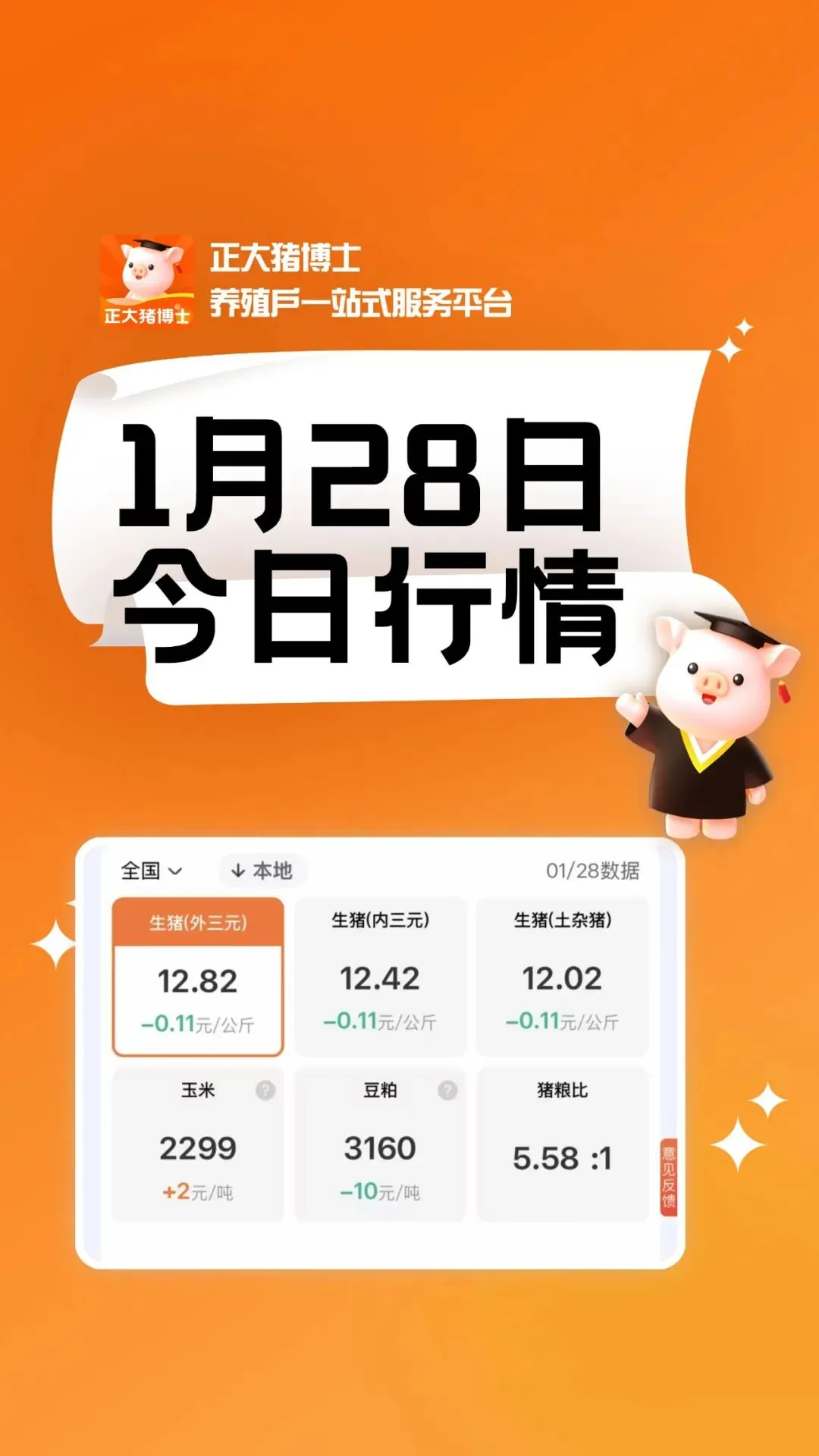 1月28日最新猪价来了!今日生猪外三元全国价格下跌,每公斤12.82元;内三元价格下跌,每公斤12.42元;土杂猪价格下跌,每公斤12.02元;玉米原料价格上涨,每吨2299元;豆粕价格下跌,每吨3160元;全国猪粮比为5.58。