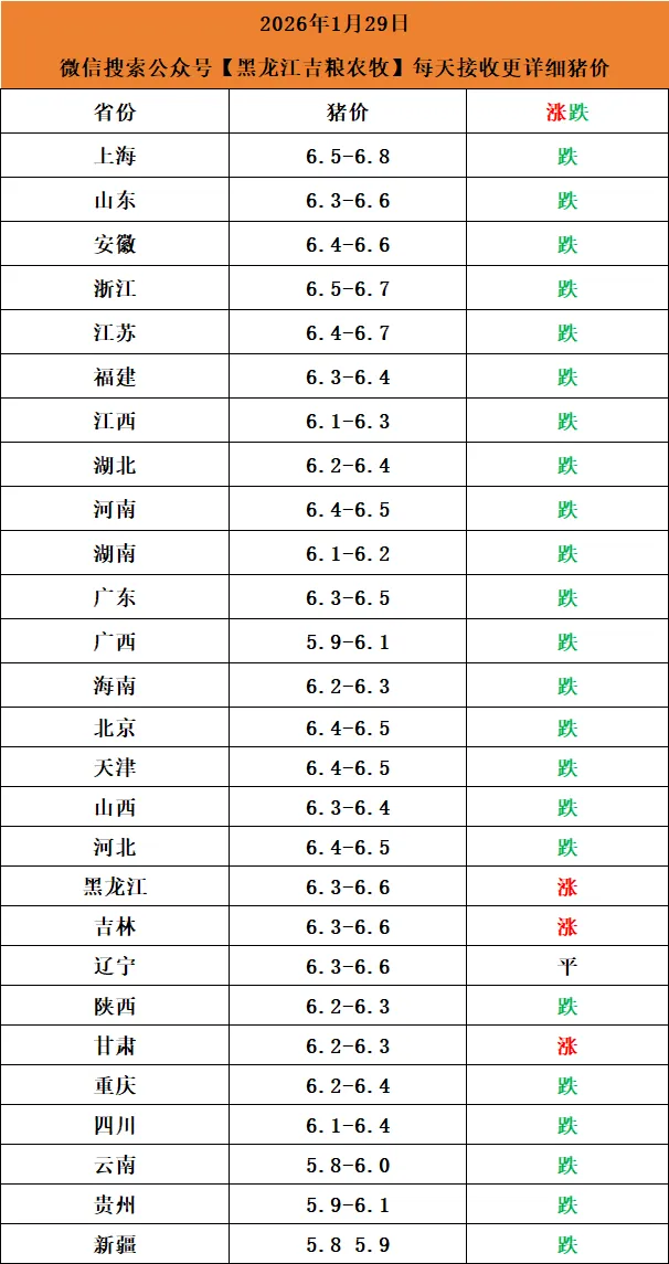【黑龙江吉粮农牧】2026年1月29日猪价早知道点击上方"蓝字" 关注我们吧!