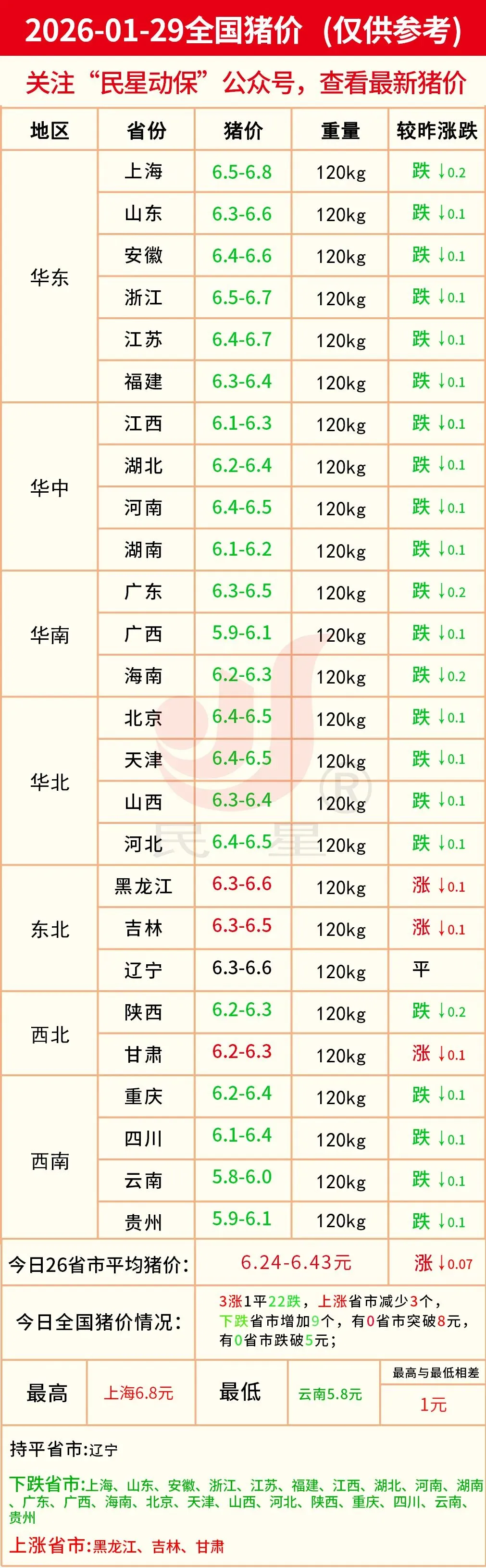 明日猪价—2026年01月29日(全国最新生猪价格) 养羊网 2026-01-28 明日猪价—2026年01月29日(全国最新生猪价格) 养羊网 2026-01-28 上一篇:2026.1.29猪价早知道 下一篇:1月猪价反弹后走弱,2月能否再涨一波? 您可能还会对下面的文章感兴趣111: 相关文章 近期价格更新!!! 2026年1月17日东莞信立鸡蛋价格早报 2025年4月13日全国各地生猪价格信息 2025年4月13日全国各地生猪价格信息