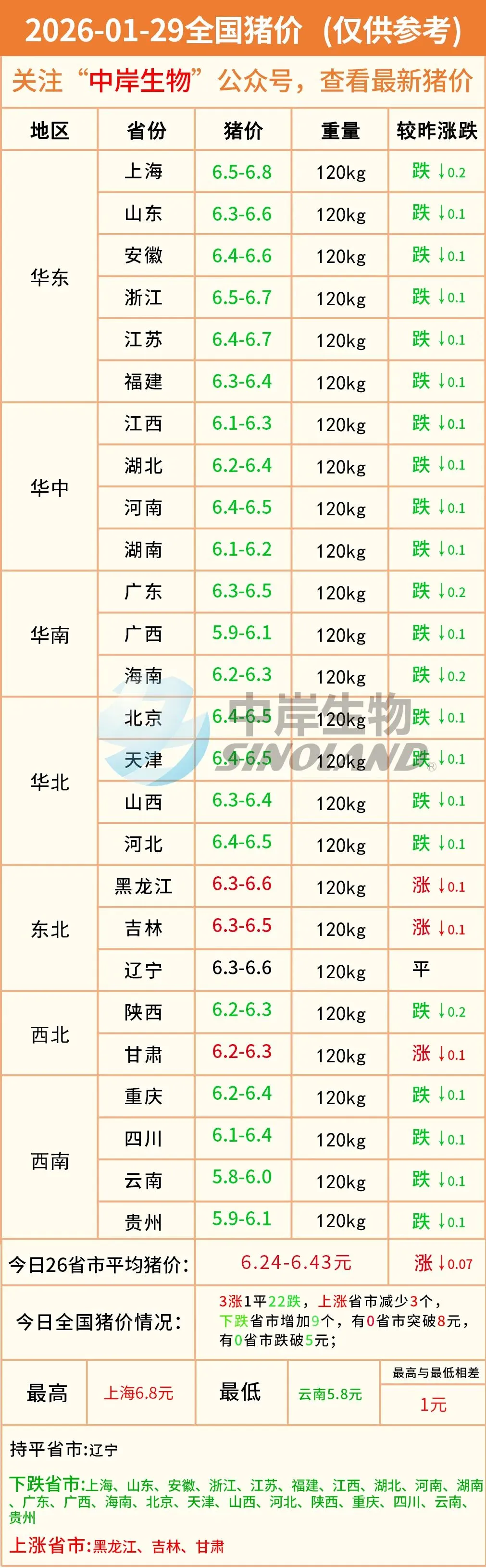 明日猪价|2026-01-29全国最新猪价(猪价已更新!) 养羊网 2026-01-28 明日猪价|2026-01-29全国最新猪价(猪价已更新!)营销中心丨0731-83806009技术服务丨0731-83806019 养羊网 2026-01-28 上一篇:【明天猪价】2026. 01.29 猪价一夜打回原型!东北成亮点! 下一篇:明日最新猪价2026.01.29 您可能还会对下面的文章感兴趣111: 相关文章 河西走廊之旅DAY2——炭窑沟村乌鞘岭 姐!又幸福了谁懂?29.9黑鸡初产蛋!! 近期价格更新!!! 南北猪价:广东浙江冲刺7元,黑龙江却加大出栏!春节前还能涨多少