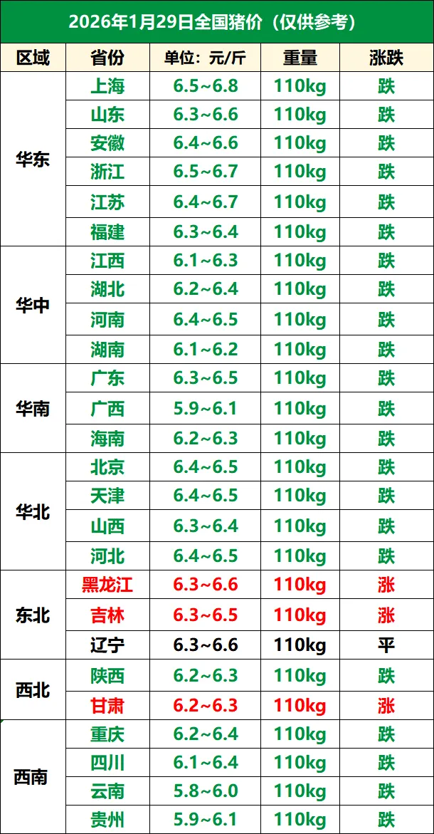 1月29日全国猪价一夜降温,下跌“六亲不认”! 养羊网 2026-01-29 1月29日全国猪价一夜降温,下跌“六亲不认”! 养羊网 2026-01-29 上一篇:今日超前猪价| (2026.1.30)仅供参考 下一篇:2026.1.29猪价快讯--福州穗丰动保 您可能还会对下面的文章感兴趣111: 相关文章 近期价格更新!!! 全家都爱喝的羊奶粉,全链把关超安心~ 2025年4月13日全国各地生猪价格信息 近期价格更新!!!