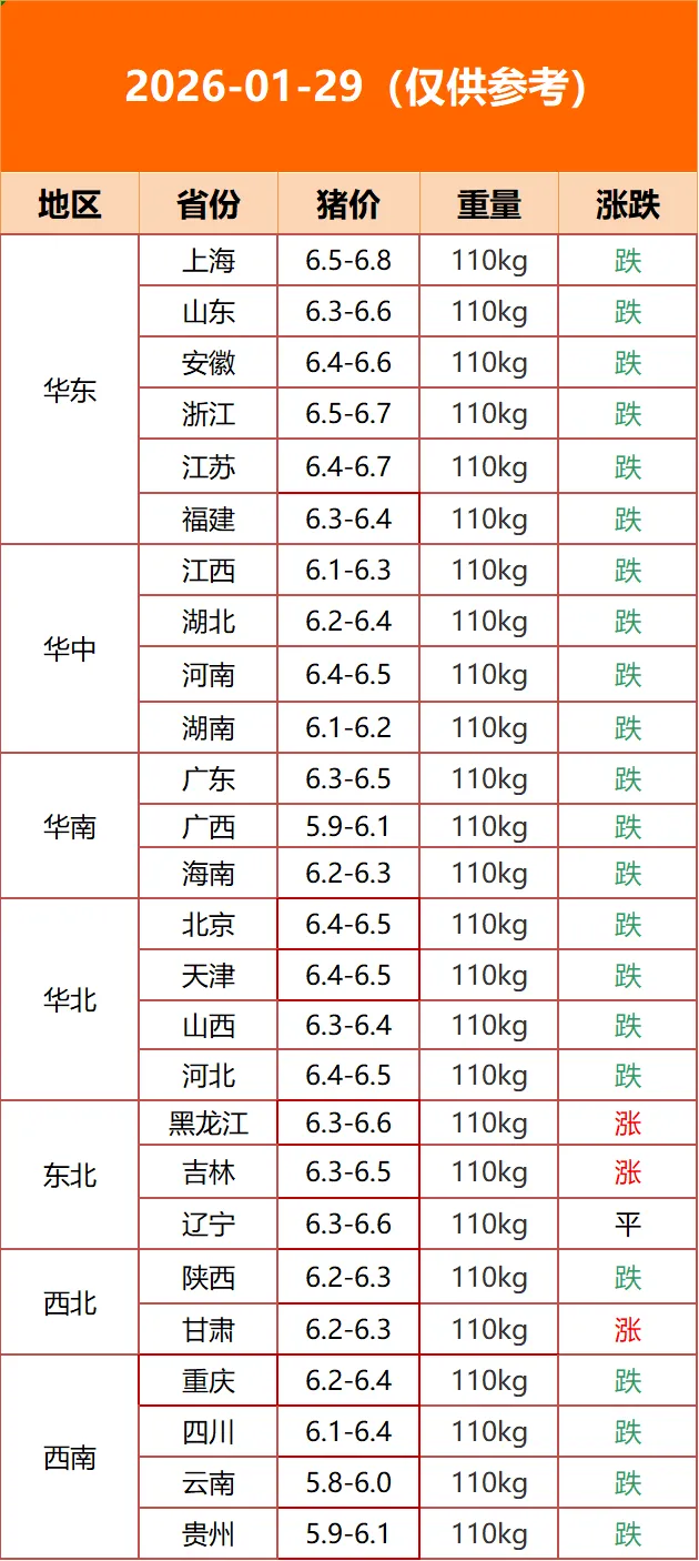 猪价有变 多地调整【2026 / 1 / 29 周四】 养羊网 2026-01-29 猪价有变 多地调整【2026 / 1 / 29 周四】股票简称:大禹生物 ? ?股票代码:920970扫描二维码关注我们做全球最好葡萄糖氧化酶更多精彩内容回复关键词 养羊网 2026-01-29 上一篇:2026.1.29猪价快讯--福州穗丰动保 下一篇:【1月第4周】生猪、饲料市场价格:猪价实现“四连涨”,头均亏损大幅收窄! 您可能还会对下面的文章感兴趣111: 相关文章 2025年4月13日全国各地生猪价格信息 养羊是个大坑 巴马香猪猪苗报价 达顿表演很到位,却败在了一盒蛋上
