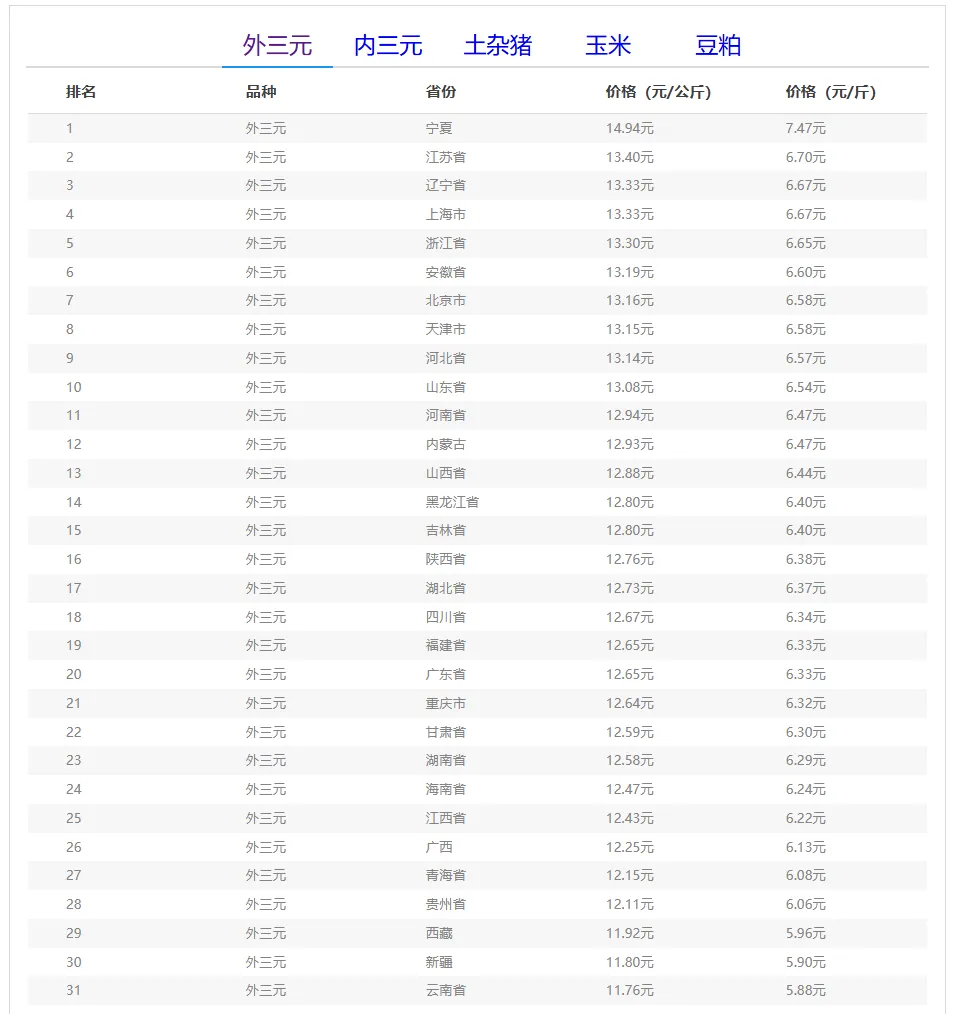 外三元排行前三:宁夏回族自治区14.94元/公斤、江苏省13.40元/公斤、辽宁省13.33元/公斤;