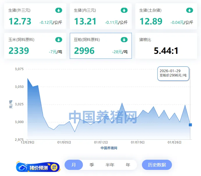 2026年01月29日-中国养猪网 全国豆粕价格走势图及涨跌表