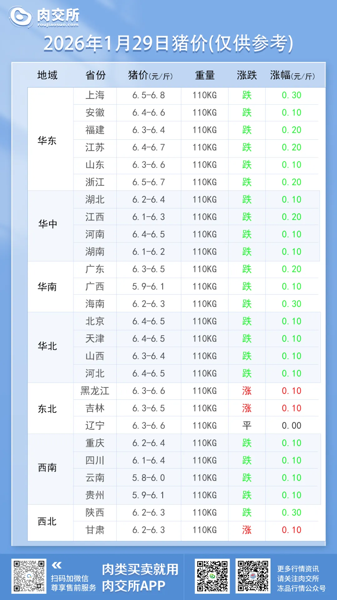 - 领跌梯队:上海、海南、陕西跌 0.3 元 / 斤(今日跌幅王),福建、江苏、浙江、江西、广东跌 0.2 元 / 斤;