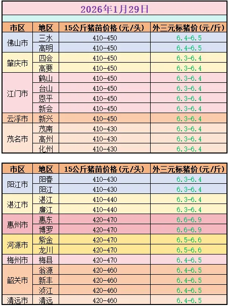 1月29日猪价速递 养羊网 2026-01-29 1月29日猪价速递广东猪苗全省各地报410~470元起,毛猪报6.3~6.9元,全省各地区价格连续四连跌,微跌0.1~0.2元,。年关行情已启动,节奏瞬息,踏准步伐。(行情仅供参考) 养羊网 2026-01-29 上一篇:2026.1.30明日猪价 下一篇:【明天猪价】 2026. 01. 30 崩盘了!猪价继续猛跌! 您可能还会对下面的文章感兴趣111: 相关文章 今日猪价(2026.1.15 ) 家人们,土鸡蛋1块钱贵吗? 2025年4月13日全国各地生猪价格信息 生活小美好!这款可生食鸡蛋超治愈
