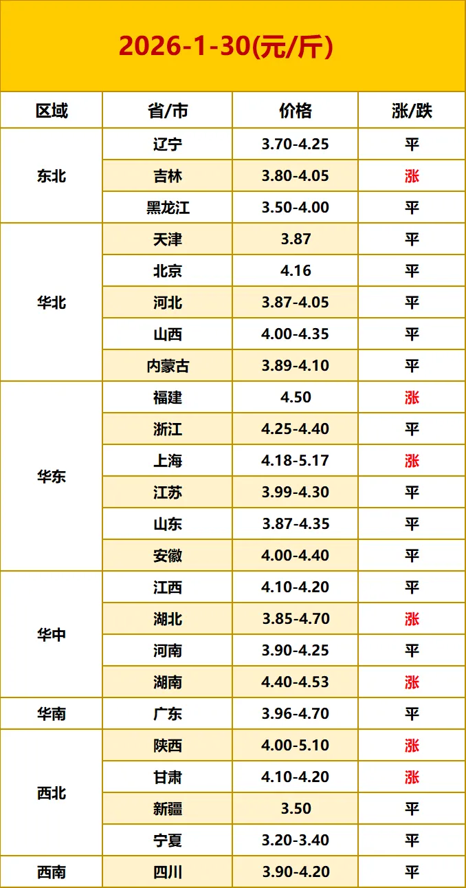 2026.1.30 今日鸡蛋价格 养羊网 2026-01-29 2026.1.30 今日鸡蛋价格蛋价日评:今日鸡蛋价格整体稳定。产蛋鸡存栏量小幅下降,库存处于偏低水平,养殖户挺价惜售,叠加前期北方物流影响,局部供应偏紧;春节节前备货需求仍在,北方务工返乡进一步拉动消费需求。短期来看,蛋价继续上行支撑有限,预计近期蛋价窄幅震荡调整。以上报价仅供参考! 养羊网 2026-01-29 上一篇:【猪价早讯】 2026. 1.30猪价!(欢迎转发) 下一篇:猪价“滑坡”下跌!!仔猪价格确疯涨85%+,高品质仔猪突破350元/头,先订先得成常态! 您可能还会对下面的文章感兴趣111: 相关文章 2025年4月13日全国各地生猪价格信息 恭喜你成为最贵的水果! 泰?推介会 2025年4月13日全国各地生猪价格信息
