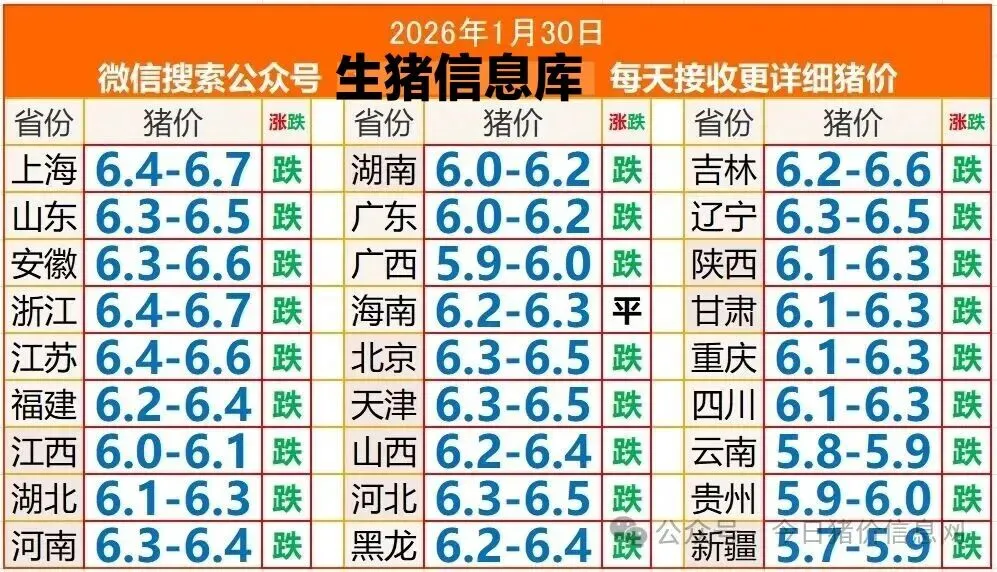 猪价下滑26.01.30 养羊网 2026-01-29 猪价下滑26.01.30 养羊网 2026-01-29 上一篇:今日鸡蛋价格(2026.1.29) 下一篇:国企转让95只自养羊,均价525元/只,内部要求“一根羊毛都不能动” 您可能还会对下面的文章感兴趣111: 相关文章 徒步-羊圈沟 庙尔沟 近期价格更新!!! 郑州/郑东万象|炉小哥烤肉|人均60?速?? 近期价格更新!!!