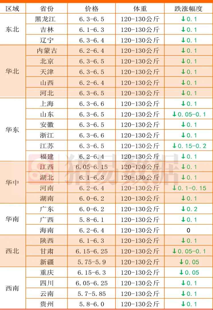 猪价下跌,近两年甚至跌倒到成本线以下,各位养殖户们束手无策,整体来看,全国生猪价格呈现大部下跌态势。今日集团猪场生猪成交价格呈现大部下跌,东北、华北、华东、西南、华南地区集团猪场猪价呈现大部下跌态势,西北、华中地区集团猪场猪价呈现跌涨调整态势。华东、华中地区龙头集团110-125公斤生猪价下跌0.2-0.4元/公斤,125-140公斤生猪价格稳中伴跌0.05元/公斤,龙头集团猪价呈现大部下跌,陕西地区部分体重段生猪价格小幅上涨。 维护猪场收益,一定要注意料肉比,尤其是在养殖行情差的时候,一定要用好的催肥产品,维护自己的养殖利润,不然料肉比跟不上,会加重自己的养殖损失和收益!