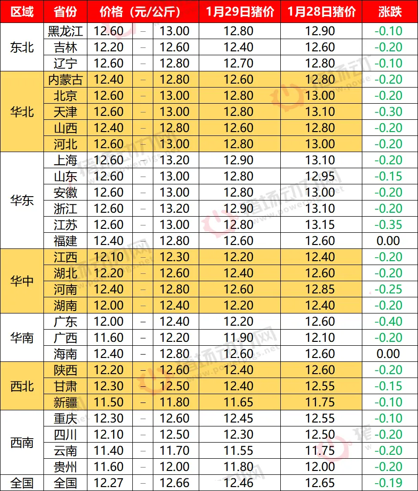 联系猪场动力网 文章授权转载?| 18974880491 新闻爆料/投稿?| zdj18774955916 商务合作?| 15173178603 加入我们?| 19974999552 1月28日全国猪价全面下跌【动力猪价】 1月27日全国猪价继续下跌【动力猪价】 1月26日全国猪价整体下跌,以北方下跌为主【动力猪价】 1月25日全国猪价北跌南涨【动力猪价】