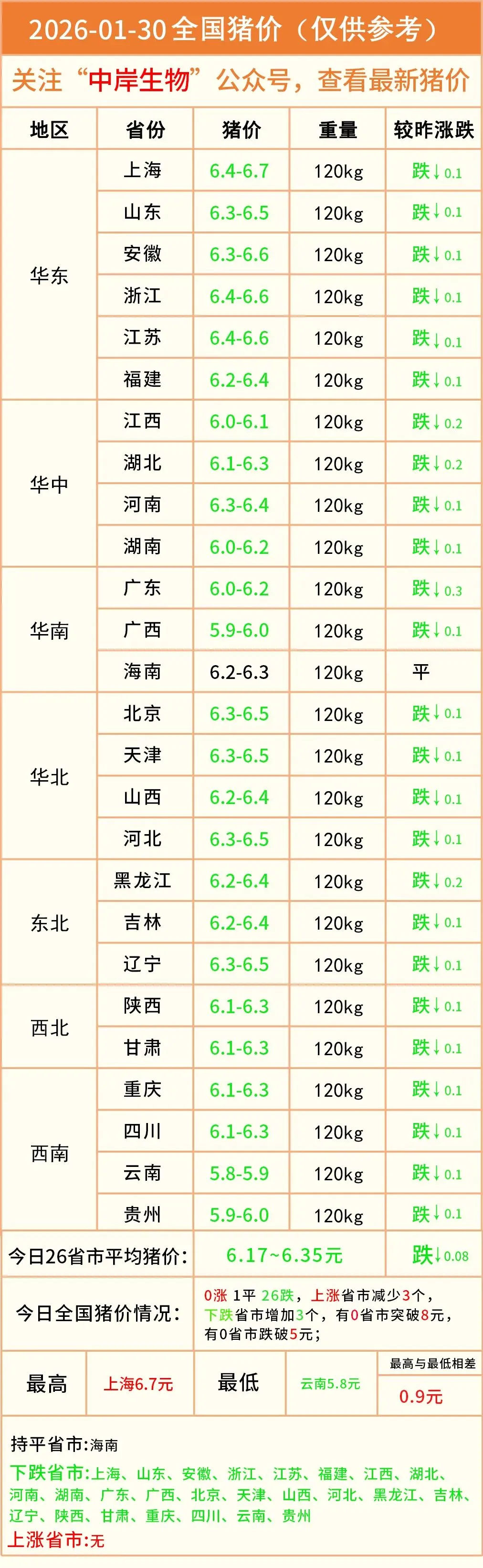 明日猪价|2026-01-30全国最新猪价(猪价已更新!) 养羊网 2026-01-29 明日猪价|2026-01-30全国最新猪价(猪价已更新!)营销中心丨0731-83806009技术服务丨0731-83806019 养羊网 2026-01-29 上一篇:【明日猪价】 2026.1.30 小幅偏弱 下一篇:最新猪价 | 1月30日猪价预测:全面飘绿,海南稳定 您可能还会对下面的文章感兴趣111: 相关文章 养殖业什么最赚钱?推荐两个养殖项目供养殖户参考 美国人吃不起鸡蛋了??Costco鸡蛋价格 这个泡泡翻译把我老公变成猪了 2025年4月13日全国各地生猪价格信息