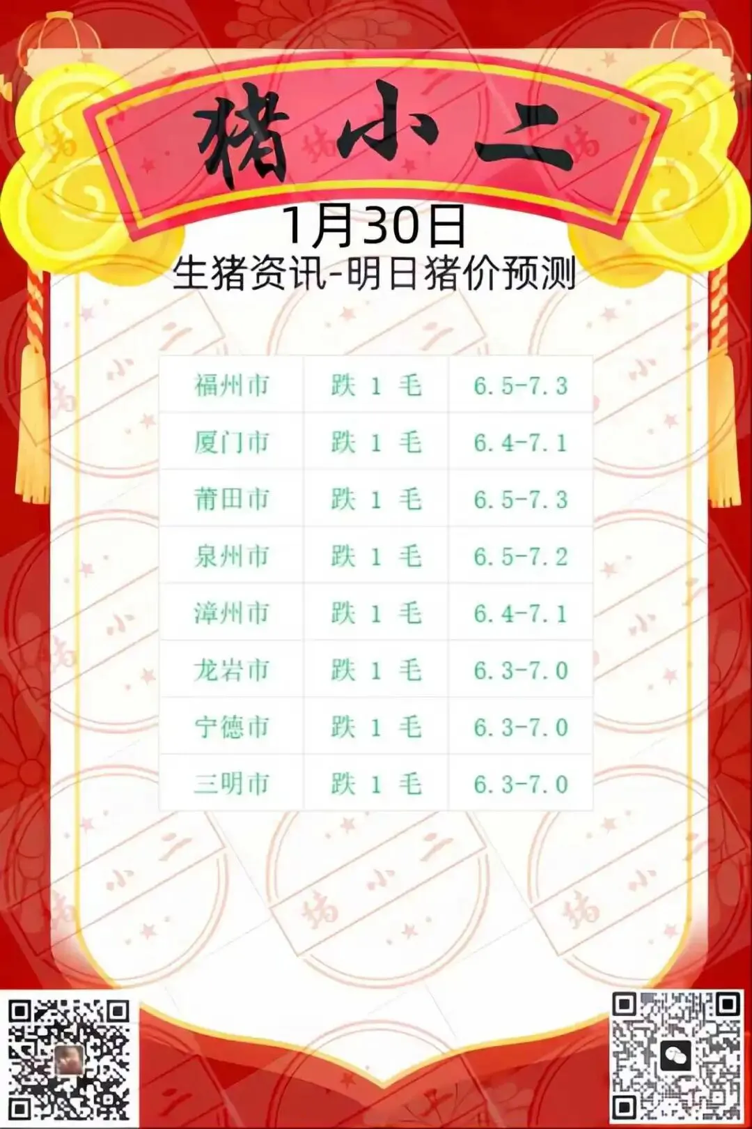 【猪小二】1.30日福建猪价预测:稳中带跌 养羊网 2026-01-29 【猪小二】1.30日福建猪价预测:稳中带跌 养羊网 2026-01-29 上一篇:2026 年春节前后猪价、鸡蛋价、菜价走势分析与展望 下一篇:明天猪价行情2026.1.30 您可能还会对下面的文章感兴趣111: 相关文章 水和城市系列:漂浮农场+温室 猪价速知20260106日调整趋稳 2025年4月13日全国各地生猪价格信息 2025年4月13日全国各地生猪价格信息