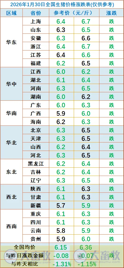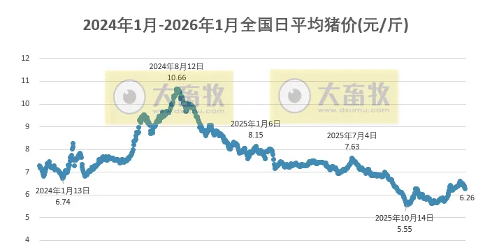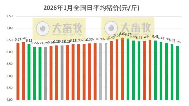 大畜牧根据27省的猪价数据,计算出2026年1月30日全国平均猪价为每斤6.26元,比昨天下跌0.07元,跌幅为1.23%,跌幅扩大,且连续5天下跌,累计下跌0.25元,为近23天最低价。