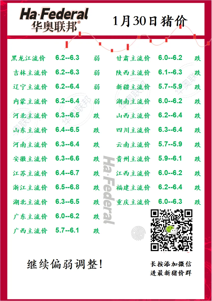 1月30最新猪价 养羊网 2026-01-29 1月30最新猪价进最新报价群 加微信 v联系电话:137 ?0084 ?5054 养羊网 2026-01-29 上一篇:2026.01.29河北鸡蛋价格 下一篇:2026年1月30日猪价信息 您可能还会对下面的文章感兴趣111: 相关文章 澳大利亚打工 2025年4月13日全国各地生猪价格信息 养羊人注意:国家开始追查养羊补帖去向,这三类人重点清查! 宁夏盐池县羊满坡家庭农牧场于2020年初建成