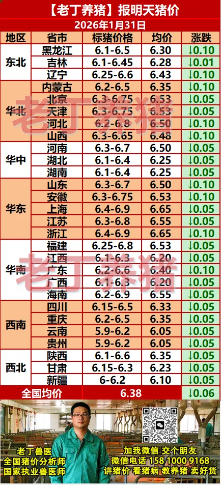 猪价大变!【明天猪价】1月31日全国猪价涨跌表!关注老丁养猪