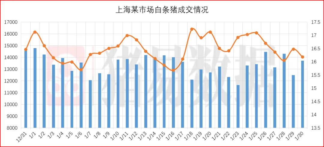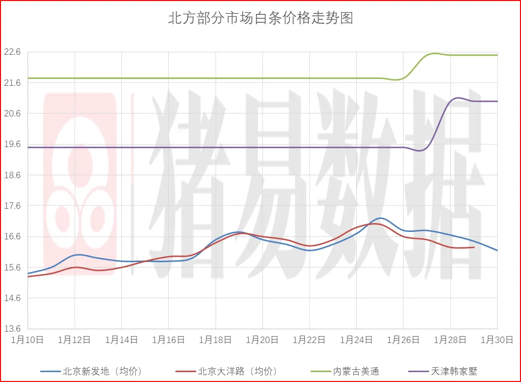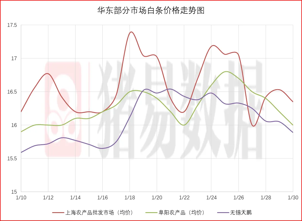 从今日北京、上海消费城市批发市场白条价格走势来看,北京、上海批发市场白条开磅价格呈现大部下跌,北京大部分市场开磅价格下跌0.2元/公斤,市场走货速度表现偏差;上海市场价格呈现下跌,部分市场成交价参考16.18-16.35元/公斤,到货量表现有所增加,市场交易情绪表现偏差,市场成交均价表现偏差。