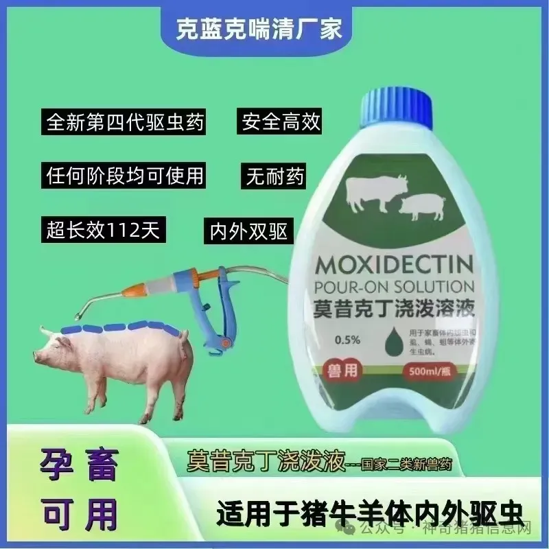 Stewart等报道0.5%莫昔克丁浇泼溶液对猪体内消化道线虫、肺线虫都有良好的驱杀效果。将0.5%的莫昔克丁浇泼剂以0.75 mg / kg 体量用于猪,14天后对猪蛔虫、猪毛首线虫、后圆线虫、有齿食道口线虫等虫体驱杀效果达98%。