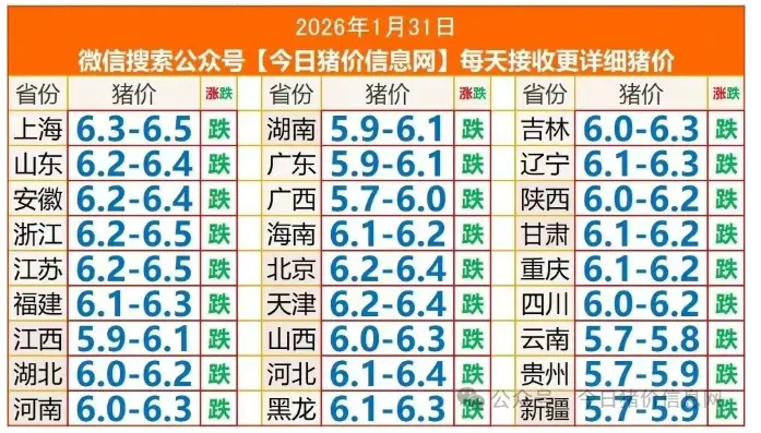 2026年01月31日全国猪价行情表 养羊网 2026-01-30 2026年01月31日全国猪价行情表以上内容源于网络,如有侵权请与我们联系,将及时删除。来源丨 今日猪价信息网 养羊网 2026-01-30 上一篇:1月30日 今日猪价 下一篇:猪价大预测】2月1日~2月3日!全国猪价! 您可能还会对下面的文章感兴趣111: 相关文章 2025年4月13日全国各地生猪价格信息 2025年4月13日全国各地生猪价格信息 2025年4月13日全国各地生猪价格信息 2025年4月13日全国各地生猪价格信息