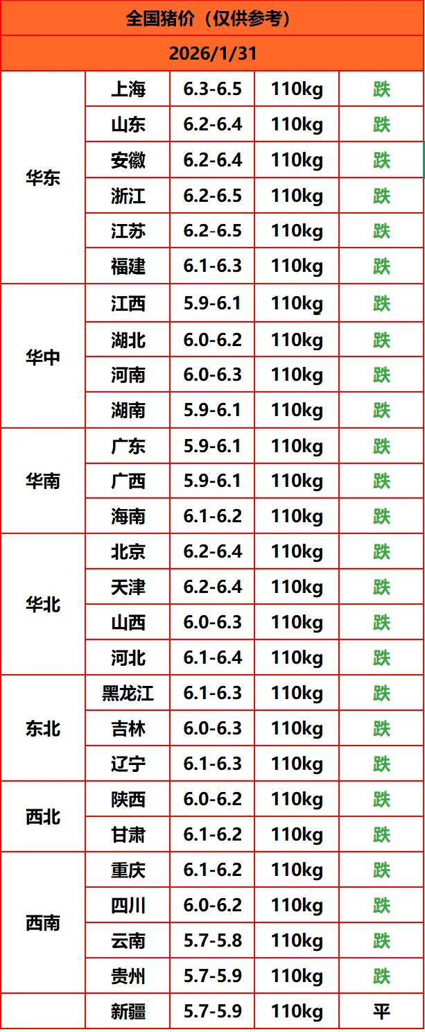 猪价再探新低!1月31日最新明日猪价!【2026/1/31周六】 养羊网 2026-01-30 猪价再探新低!1月31日最新明日猪价!【2026/1/31周六】点击下方?和关注,为您推荐更多猪价信息2026年1月31日猪价明日全国猪价行情走势0涨1平26跌? 养羊网 2026-01-30 上一篇:【东北猪价】 2026. 1. 31 全国猪价! 下一篇:【猪价早讯】 2026. 1.31猪价!(欢迎转发) 您可能还会对下面的文章感兴趣111: 相关文章 近期价格更新!!! 尼泊尔??加德满都羊排避雷! 近期价格更新!!! 巴马香猪多少钱一头
