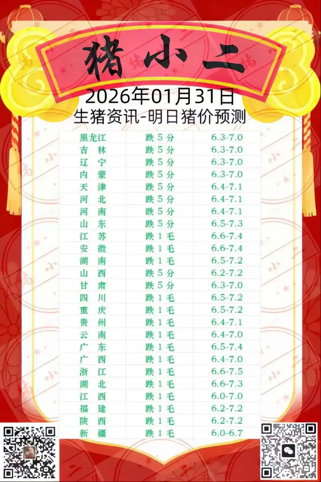【猪小二】1.31日全国猪价预测:跌 养羊网 2026-01-30 【猪小二】1.31日全国猪价预测:跌 养羊网 2026-01-30 上一篇:明日猪价——2026年1月31全国生猪价格! 下一篇:滁州正大浓缩料1540比迈*浓缩料按猪价22元/公斤计算每头猪多赚18.6元. 您可能还会对下面的文章感兴趣111: 相关文章 〖鸡蛋价格早报〗2026年1月9日 生猪保价为养殖户提供价格保障服务 高山黑山羊 宠物险拼团,低于8折??后天截团?????