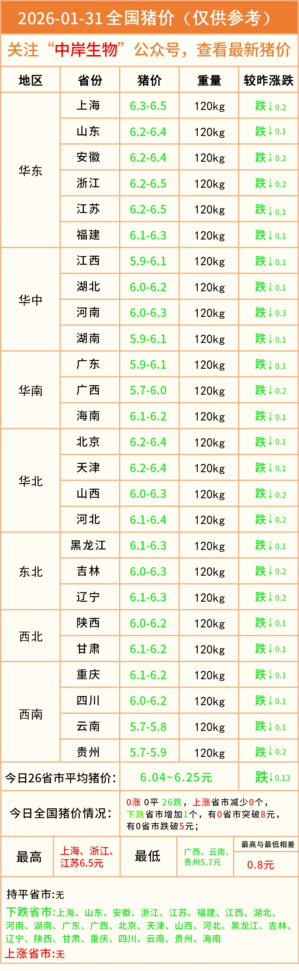 明日猪价|2026-01-31全国最新猪价(猪价已更新!) 养羊网 2026-01-30 明日猪价|2026-01-31全国最新猪价(猪价已更新!)营销中心丨0731-83806009技术服务丨0731-83806019 养羊网 2026-01-30 上一篇:【拉猪啦】1.31-猪价行情与买卖猪信息!(继续下跌,何时反弹?) 下一篇:【猪价预测】2月1-2月4 猪价预测 您可能还会对下面的文章感兴趣111: 相关文章 揭秘这些抖音账号到底值多少钱 2025年4月13日全国各地生猪价格信息 近期价格更新!!! ?厨房神器!鸡蛋收