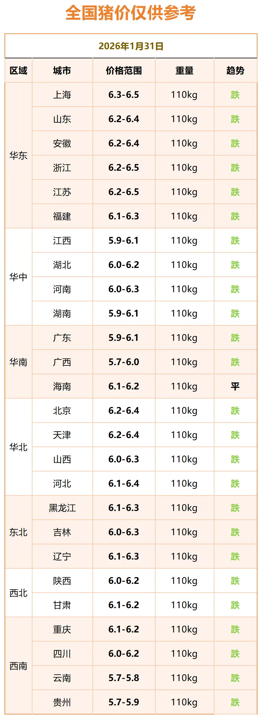 明日猪价早知道~全国地区猪价下跌,只有一个地区猪价持平! 养羊网 2026-01-30 明日猪价早知道~全国地区猪价下跌,只有一个地区猪价持平!猪价播报2026年1月31日全国猪价播报全国猪价播报~END~长按识别二维码关注我们 养羊网 2026-01-30 上一篇:【明日猪价】2026-1-31全国生猪价格 下一篇:2026.1.31,鸡蛋价格快讯 您可能还会对下面的文章感兴趣111: 相关文章 养殖骗局!谨慎投资 土鸡蛋,自己家孵的小鸡下的蛋? 山姆商品测评之105:精选鲜鸡蛋 【河南?南阳鸡蛋价格播报】2026年1月29日