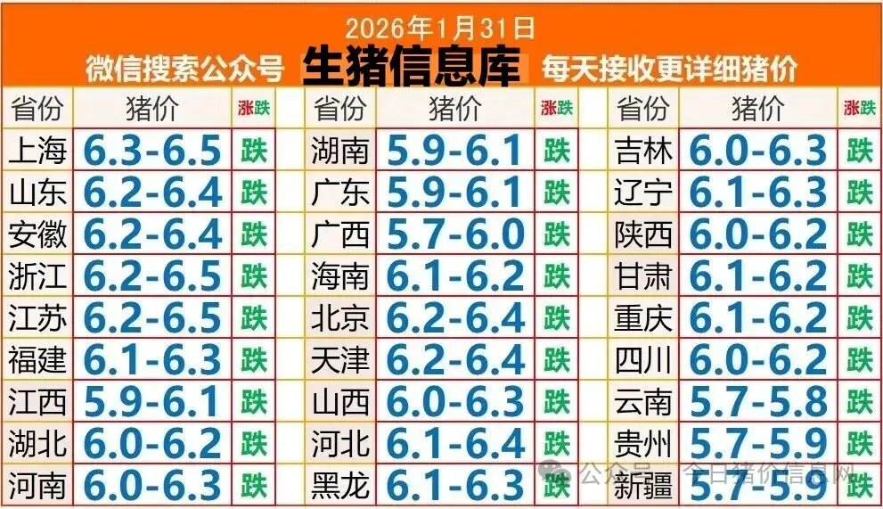 猪价下滑26.01.31 养羊网 2026-01-31 猪价下滑26.01.31 养羊网 2026-01-31 上一篇:政策要转向?2026-2028年,养猪养羊散户或迎帮扶红利! 下一篇:猪价跌跌不休!何时是头?明天(2026.1.31)全国猪价涨跌表 您可能还会对下面的文章感兴趣111: 相关文章 近期价格更新!!! 才发现外卖红包可以买鸡蛋 2025年4月13日全国各地生猪价格信息 猪价大预测】1月28日~1月31日!全国猪价大预