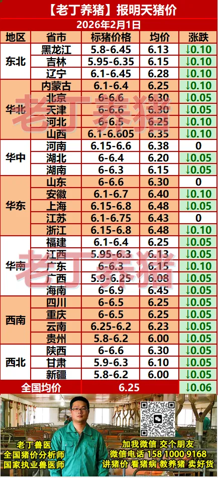 猪价大变!【明天猪价】2月1日全国猪价涨跌表!关注老丁养猪