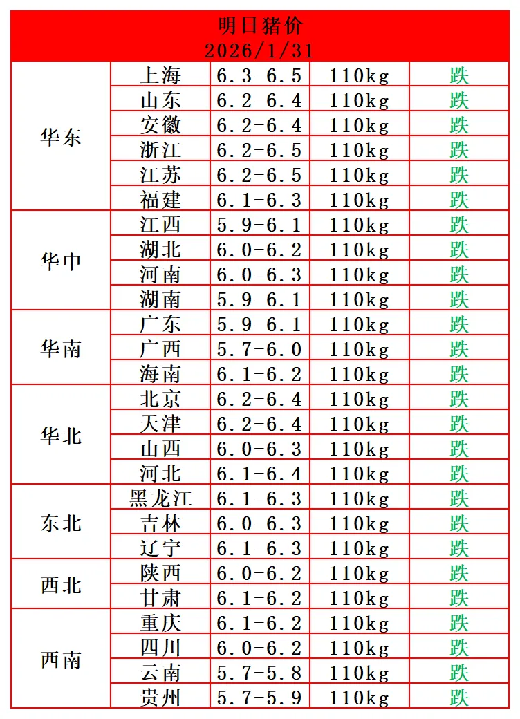 【明日猪价】1月31日猪价继续下跌,多省猪价跌到5元区间! 养羊网 2026-01-31 【明日猪价】1月31日猪价继续下跌,多省猪价跌到5元区间! 养羊网 2026-01-31 上一篇:【华中猪价】26.1. 31 全国猪价!! 下一篇:【超前猪价大预测】2月1日~2月3日全国猪价大预测 您可能还会对下面的文章感兴趣111: 相关文章 2025年4月13日全国各地生猪价格信息 2026年1月27日鸡蛋价格行情,仅供参考 近期价格更新!!! 近期价格更新!!!