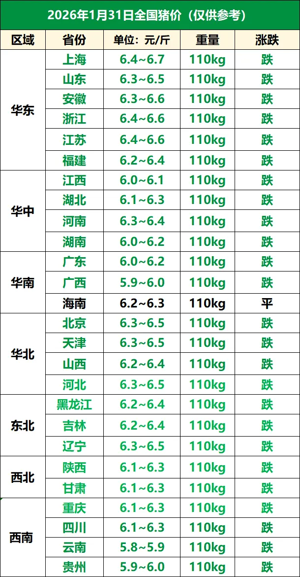 1月31日全国猪价一夜猛降,下跌“势如破竹”! 养羊网 2026-01-31 1月31日全国猪价一夜猛降,下跌“势如破竹”! 养羊网 2026-01-31 上一篇:2026年1月31日鸡师傅鸡蛋价格最新报价行情参考... 下一篇:【超前猪价大预测】2026年02月02日~2026年02月04日 您可能还会对下面的文章感兴趣111: 相关文章 近期价格更新!!! 哈尔滨同城出荷兰猪蜜袋鼯小河马 近期价格更新!!! 2025年4月13日全国各地生猪价格信息