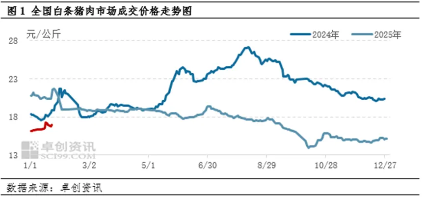 进入1月下旬,生猪市场在节日预期的推动下,呈现出明确的回暖迹象。根据卓创资讯的监测数据,截止到2026年1月26日,1月全国白条猪肉市场月度平均成交价已达到16.56元/公斤,较2025年12月继续上涨。这轮自2025年10月低点启动的反弹能延续至今,主要得益于母猪产能去化效果的初步显现。
