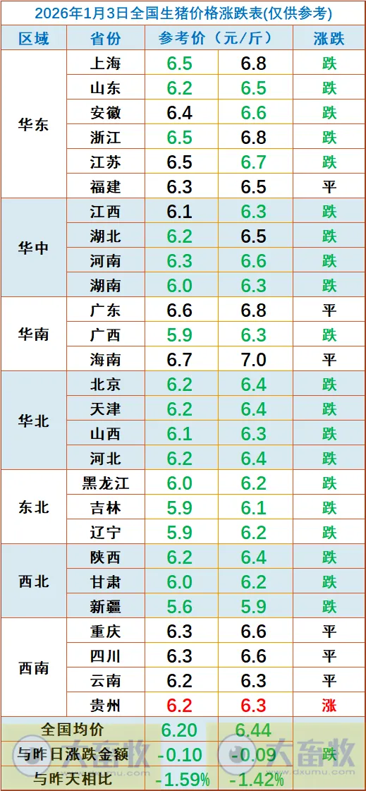 大畜牧根据27省的猪价数据,计算出2026年1月3日全国平均猪价为每斤6.32元,比昨天下跌0.1元,跌幅为1.5%,止涨转跌,且结束连续7天的上涨。