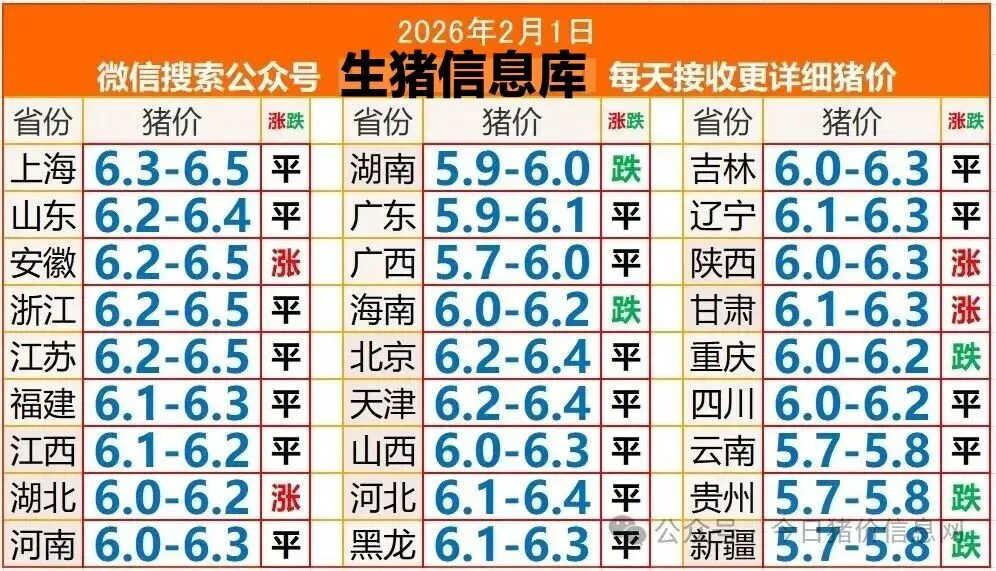 猪价26.02.01 养羊网 2026-01-31 猪价26.02.01 养羊网 2026-01-31 上一篇:猪价二次探底预警!多地下跌超3毛,全国范围明显下行,年前是否上涨? 下一篇:猪价大预测】2月2日~2月5日全国猪价大预测! 您可能还会对下面的文章感兴趣111: 相关文章 生猪日度点评:小作文引爆宏观情绪,商品普涨 2025年4月13日全国各地生猪价格信息 2025年4月13日全国各地生猪价格信息 2025年4月13日全国各地生猪价格信息