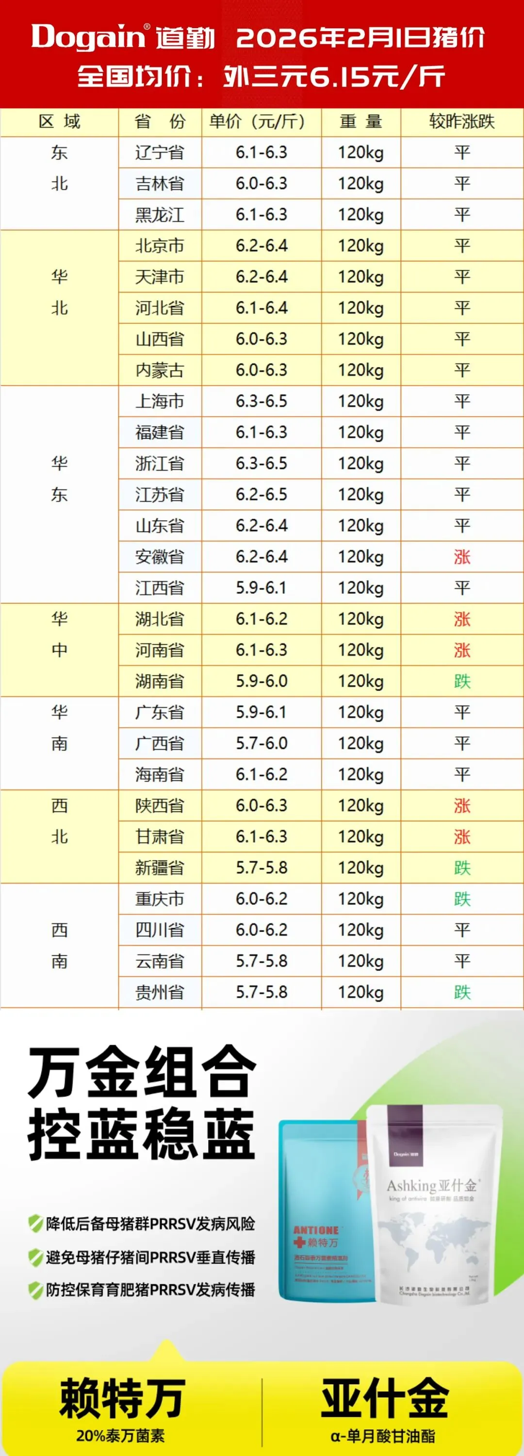 2月1日,猪价信息 养羊网 2026-01-31 2月1日,猪价信息 养羊网 2026-01-31 上一篇:【明日猪价】2月1日:猪价大涨、暴涨!猪价“浴火重生”,马上大涨价!2月全国最新如何? 下一篇:2026-2-1 明日猪价早预知 您可能还会对下面的文章感兴趣111: 相关文章 本周饲料原料价格分析 2025年4月13日全国各地生猪价格信息 在烟台一个月入账12w突然对很多事情无感了 发个价格参考,最近比较稳定