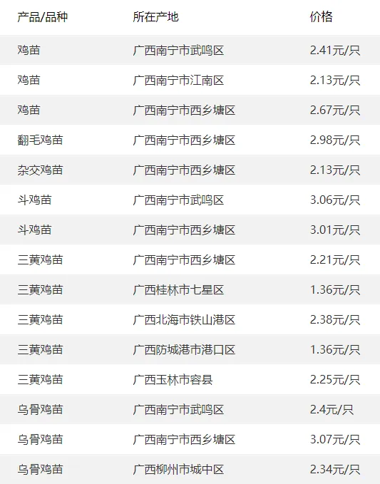 广西部分地区鸡苗价格