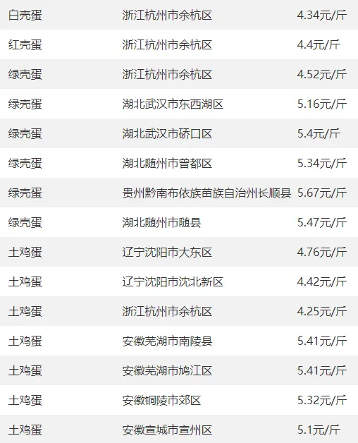 全国部分地区鸡蛋价格