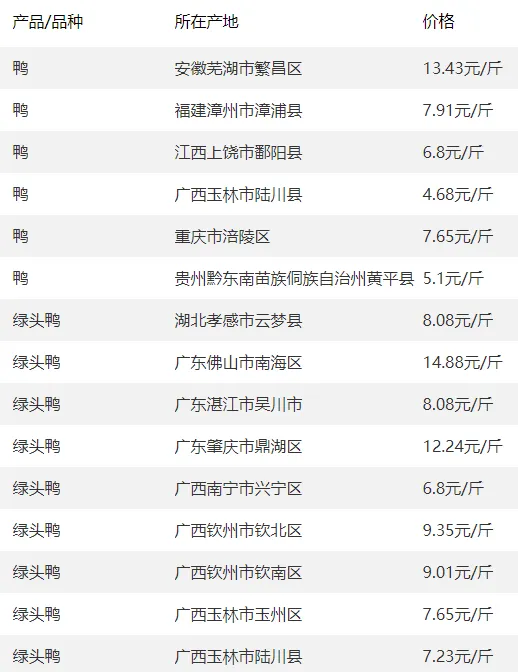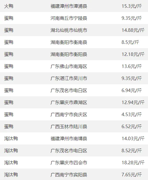 全国部分地区鸭的价格参考?