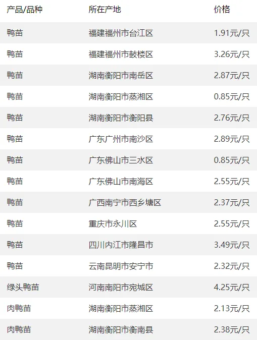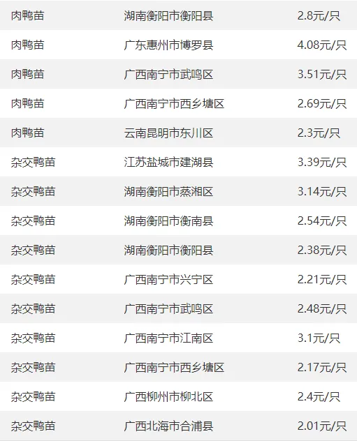 全国部分地区鸭苗价格参考