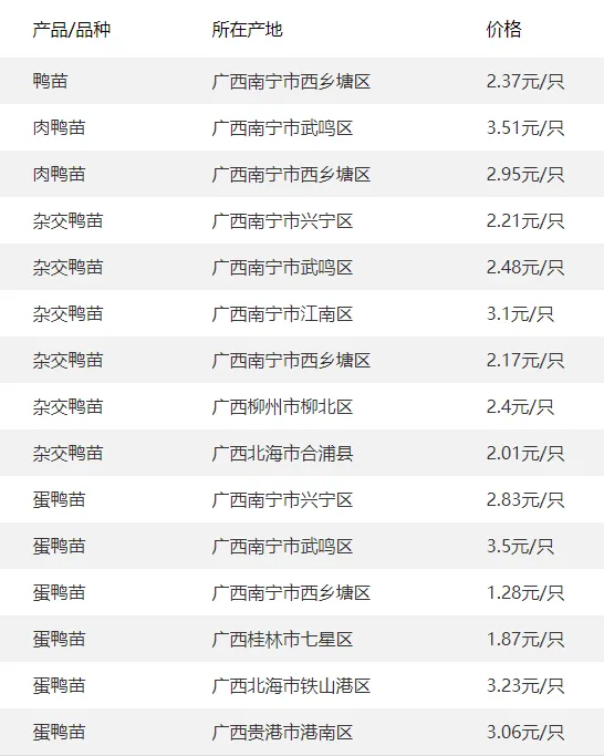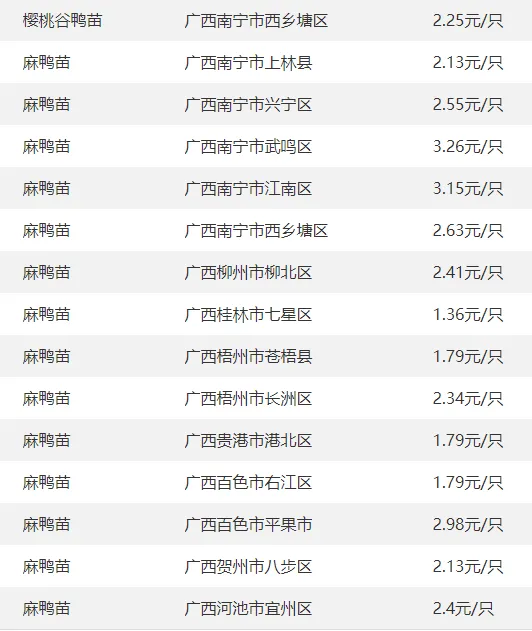 广西部分地区鸭苗价格参考