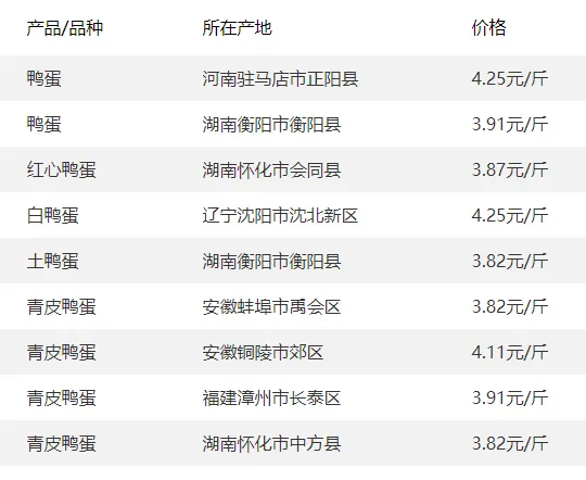 全国部分地区鸭蛋价格参考