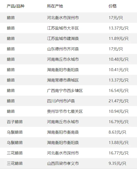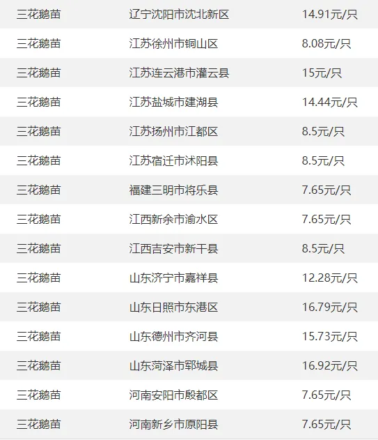 全国部分地区鹅苗价格参考