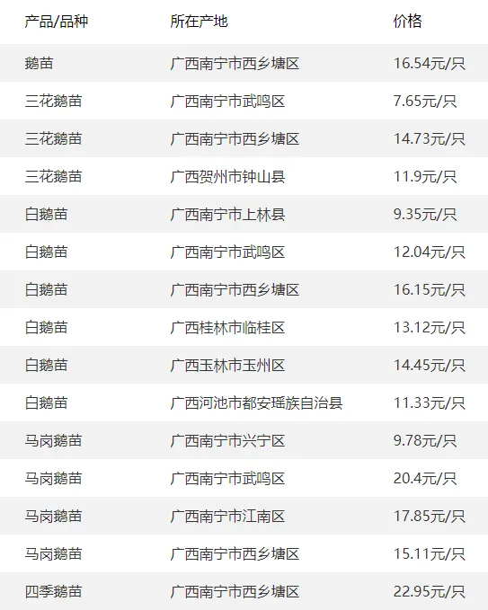 广西部分地区鹅苗价格参考