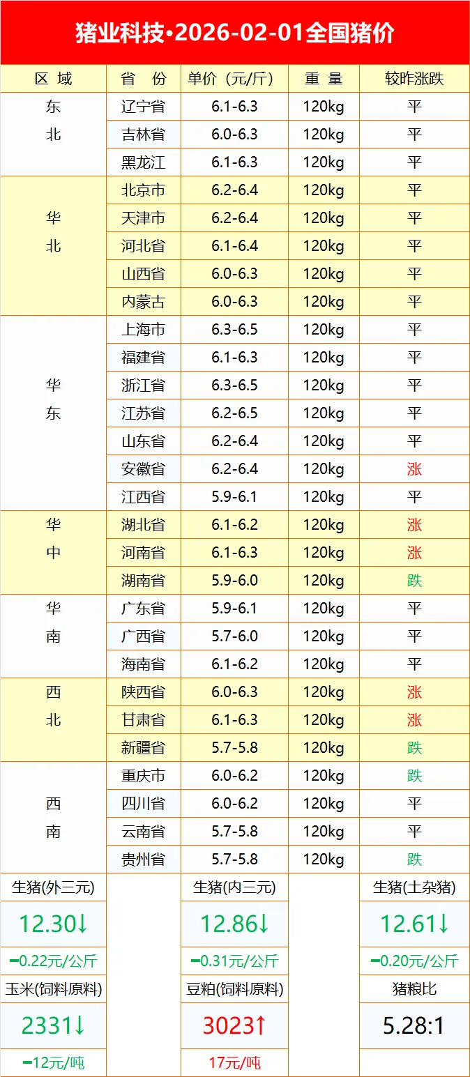 2026-02-01明日猪价 养羊网 2026-01-31 2026-02-01明日猪价? ?别忘了点个在看哦? 养羊网 2026-01-31 上一篇:明日猪价 | 2026.2.1日~全国各地最新猪价 下一篇:普跌潮褪去,猪价终于稳了!明天(2026.2.1)全国猪价涨跌表 您可能还会对下面的文章感兴趣111: 相关文章 2025年4月13日全国各地生猪价格信息 2025年4月13日全国各地生猪价格信息 满满的天然纯土鸡蛋 养牛真的累吃人