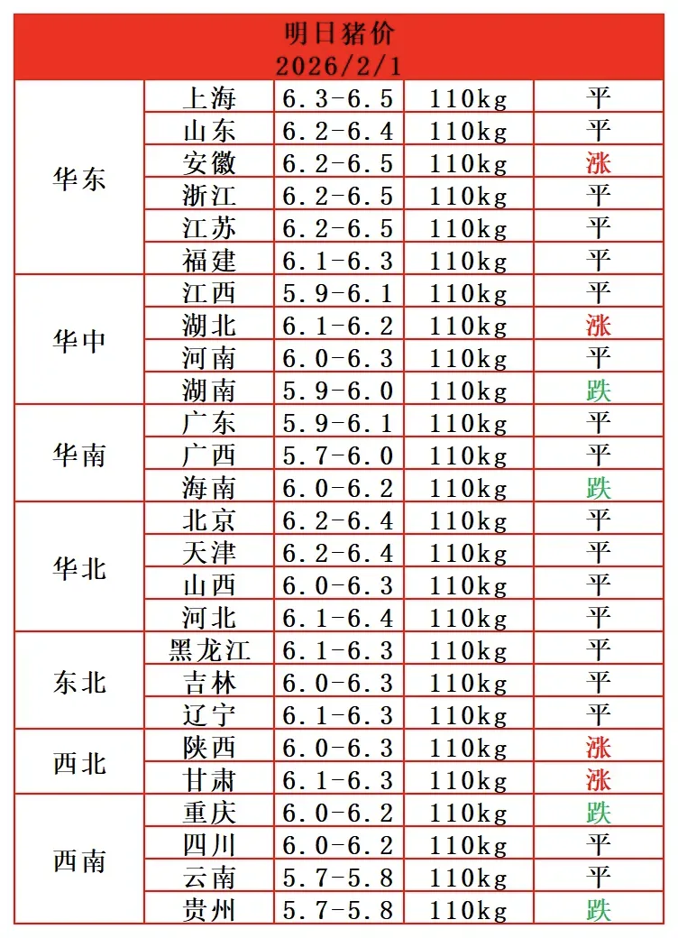 2026.2.1最新猪价行情 养羊网 2026-01-31 2026.2.1最新猪价行情养猪省心省力出栏早详情咨询:17838182713 养羊网 2026-01-31 上一篇:2026年1月31日鸡蛋出仓价格 下一篇:2026. 02. 01 下调结束!猪价要反弹! 您可能还会对下面的文章感兴趣111: 相关文章 2025年4月13日全国各地生猪价格信息 2026.1.15-明日猪价(步步高升,猪价继续往上涨!) 2026年1月17日最新鸡蛋价格行情今日蛋价 猪价丨1月16日 明日猪价早知道